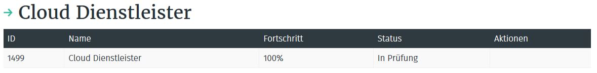 Ihre Angaben werden nun auf Vollständigkeit und Konsistenz geprüft. Während der Prüfung können Sie Ihre Antragsdaten, inklusive der Stammdaten, der referenzierten Subunternehmen und Rechenzentren sowie der referenzierten Zertifikate nicht bearbeiten. Ihr Antrag ist nun „In Prüfung“.