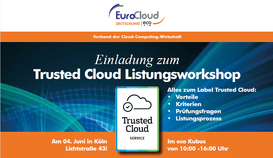 Wir freuen uns, Anbietern von IaaS, SaaS und PaaS die Teilnahme an einem exklusiven Trusted Cloud Listungsworkshop zu ermöglichen! Bei EuroCloud als Veranstalter werden die Vorteile des Labels und des zugehörigen Netzwerkes, sowie Kriterien und Prüfungsfragen rund um den Listungsprozess vermittelt.